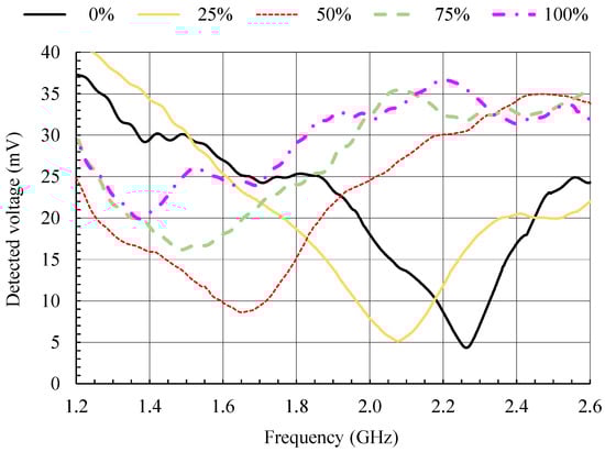 To test the measurement setup in Figure 19, ten measurement series were performed, five for increasing moisture content from 0% to 100% and five for decreasing moisture content from 100% to 0%. The average detected voltages from all ten measurement series for moisture contents of 0%, 25%, 50%, 75% and 100% are shown in Figure 20. The frequencies at which the detected voltage minima occur are in good agreement with the resonant frequencies (S11 minima) in Figure 5.