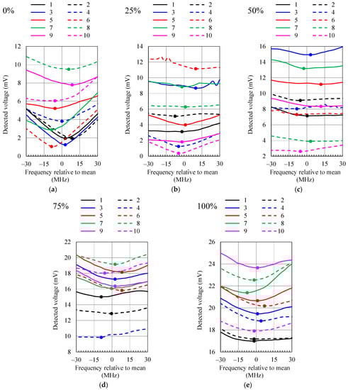 Measured detected voltage around the minima for ten measurement series and for moisture content: (a) 0%, (b) 25%, (c) 50%, (d) 75% and (e) 100%. The series for increasing moisture content are marked with odd numbers and plotted with solid lines, while the series for decreasing moisture content are marked with even numbers and plotted with dashed lines. The marker shows the minimum detected voltage.