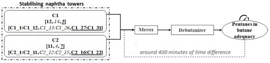 Columns C1 and C2 in Figure 1 represent two different stabilising naphtha towers. After a refining process of the raw crude, stabilised naphtha and Liquefied Petroleum Gas (LPG) are obtained at the bottom and the top of the columns C1 and C2, respectively. The resulting LPG is then pumped from the top of columns C1 and C2 to Merox, a gas sweetening unit in which the sulphur is removed. Finally, the sweetened gases pass to the debutanizer column, where propane and butane are separated. The estimated duration of the described unit chain, from stabilising naphtha columns to the end of the debutanizer column, is 400 min.