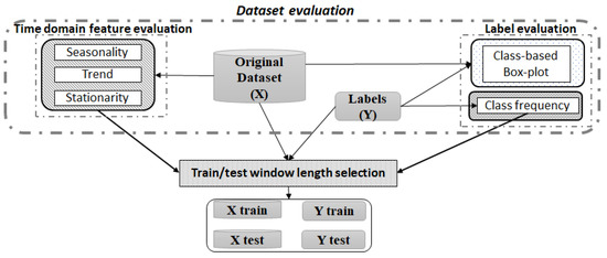 In order to create a reliable model and to reproduce the offline training and online quality prediction practice, the dataset split is done respecting the temporal order of the data. As determined in Section 3.1.1, if the time series is not stationary, employing all available historical data can disturb the prediction ability of the model due to the evolving time series statistical properties over time. In such scenario, the window length for the training set must be selected in order to capture the variability of the input data and, thus, the current properties of the time series. Likewise, as described in Section 3.1.2, the training set (X train, Y train) is selected in such a way that all classes are represented.