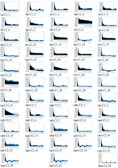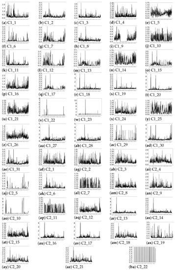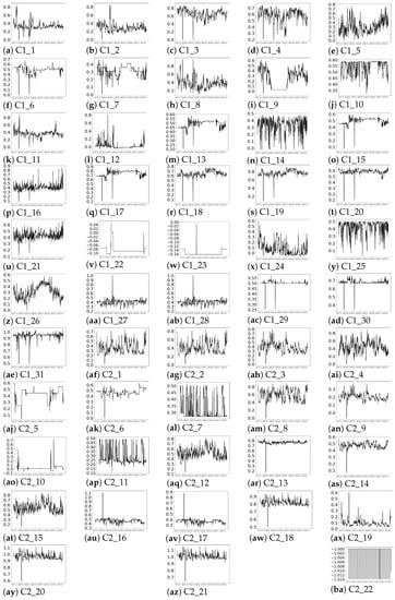 - Trend: the p-values obtained from applying the non-parametric Mann–Kendall test are shown in Table 2. It can be observed that 17 time series (C1_1:C1_4,C1_6:C1_9,C1_11, C1_17, C1_24, C2_3, C2_9:C2_10,C2_13:C2_14) present p-values lower than ; for those features, can be rejected. In the rest of the cases, there is no evidence for rejecting the hypothesis of no tendency. Thus, in 36 out of 53 time series, no trend is observed.