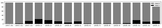 Regarding the class samples distribution, the analysis determines that the dataset is highly imbalanced as just of the samples belong to class 1. In addition, the distribution of the classes varies over time, as it can be observed in Figure 7, where up to four consecutive months with less than of samples belonging to class 1 are found. Consequently, such periods do not fulfil the class distribution required for training the model; the samples selected for both training and testing must be representative of both classes. As stated in Section 4.1.1, the optimal window comprises 3 consecutive months of historical data. Consequently, the train/test set are obtained from consecutive periods, where approximately of the samples belong to class 1.