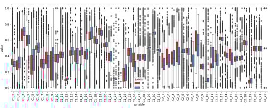 Conversely, Figure 8 depicts a class-based box-plot. The bottom of the lower whisker and top of the upper whisker represent the minimum and maximum values, respectively and the points above or below the whisker are outliers. The top, medium and bottom of the box depict 75, 50 and 25 percentiles (Q3, Q2 and Q1), respectively. In Figure 8, it can be observed that, for each feature, if comparing the interquartile range, the box representing the samples of class 0 overlaps with the box of class 1. Q1 and Q3 estimated for class 0, and the values of class 1 are the same in features C1_22, C1_23 and C2_22. The box representing class 1 is totally contained in the values that the box representing class 0 takes in features C1_4 and C1_11. Similarly, in C1_6, C1_9, C1_10, C1_14, C1_16, C1_21, C1_25, C1_29, C1_31, C2_3, C2_6, C2_7, C2_9, C2_10, C2_19, the box representing class 0 is totally overlapped with the box of class 1. Thus, the overlapping level between the samples from Q1 to Q3 from one class with respect to the other class is up to . The lowest overlapping proportion of the interquartile range of class 1 contained in the interquartile range of class 0, , is found in C2_5, but in this feature, the of the interquartile range of class 0 overlaps the interquartile range of class 1. Then, the classes are not linearly separable in any of the features. Based on these results, ML algorithms that handle the non-linearity of the features are considered in the autoML approach for creating the soft-sensor.