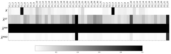 Since each normalisation method (ST, MM and MAD) depends on different statistics, and given that each feature is transformed differently depending on its statistical characteristics, it is expected that a different subset of features predominate for each normalised dataset ( and ). Then, in this work, the range of the features is employed as an indicator of the influence of each feature in the algorithm performance []. To facilitate the comparison between features of the same dataset, the ranges are divided by the maximum range of the dataset . This way, the most influencing features, i.e., with a range close to the maximum one, present a normalised range close to 1. In contrast, features that present range value much lower than the maximum one, being, in comparison, insignificant ranges, will present a normalised range close to 0.