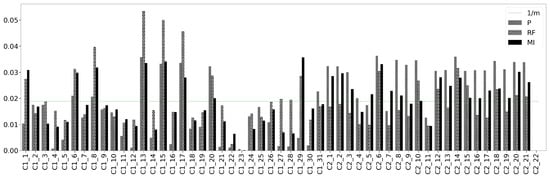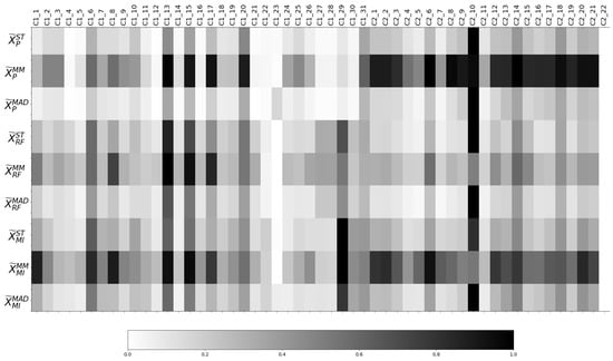 Furthermore, in Figure 10, the weights estimated by the three FW methods for C2_22 and C1_23 are approximately zero. In Figure 11, C2_22 presents a normalised range of zero, while, due to the high normalised range in C1_23, this feature presents a higher or equal normalised range than features that presented higher weight in Figure 10, such as C1_27, C1_28 or C2_11. Similarly, recall that in Table 5, the most important features according to each FW method are collected. However, in Figure 9, it can be observed that, after the joint employment of weights estimated with P or RF and ST or MAD normalisation methods, or MI combined with MAD normalisation, the feature with the highest contribution in terms of the range is C2_10—which does not appear in Table 5—but in Figure 9, it represents the third highest value in terms of ranges in ST and MAD. Thus, it can be concluded that the FW weights can be significantly disturbed by the normalisation methods.