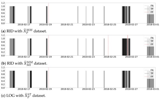 Figure 12 depicts the graphical representation of the models with recall higher than from Table 9. The grey vertical lines represent the False Negative (FN) samples, and the black vertical lines represent the True Positives (TP) samples. Finally, the vertical red dash-dotted lines, with a length of , are the False Positive (FP) samples that the soft-sensor expects to minimise. Thus, Figure 12 displays the reliability of the model for correctly classifying samples from class 1, in spite of not being able to detect all the improvable samples.