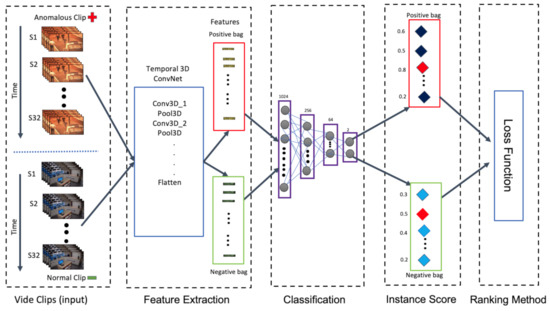 As it has been explained in this section, there exists several proposals for anomaly detection in the literature, based on unsupervised, semi-supervised, and fully-supervised deep learning techniques. To avoid the drawbacks of the unsupervised an fully-supervised methods, this paper presents a novel approach based on MIL. Moreover, to reduce the number of false negatives that appear in the described MIL proposals, there is introduced a new ranking loss function that is able to reduce the variability for anomalous sequences and increases the difference between the scores for normal and abnormal sequences, improving the accuracy. The proposed approach is described in detail below.