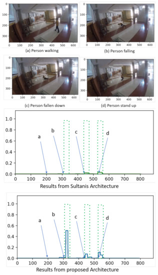 Within this context, as it can be seen in Figure 2, the proposed methodology yields high anomaly scores for the scenarios presenting the person’s fall ((b) and (c)) and getting up (d), whereas a low anomaly score for the normal event (person walking) in scenario (a). Besides, the model from Sultani’s paper gives a moderate score for scenario (b) and a low anomaly score for all remaining scenarios (a,c,d), which supposes a false negative. Thus, comparing the anomaly scores, the values assigned to scenario (b) by the proposed model are significantly high (near the maximum), so it can be concluded as an anomalous scenario. In the case of scenarios (c) and (d), the proposed model assigns a moderately high score while the one proposed by Sultani assigns a lower value.
