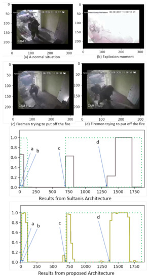 The second sample from UCF-Crime, in Figure 7, is an explosion. In this example, scenario (a) depicts a normal situation. Scenario (b) shows the explosion moment, and scenarios (c) and (d) present firemen trying to put off the fire. In the ground truth, scenario (a) is labeled as normal while scenarios (b,c,d) are labeled as anomalous.