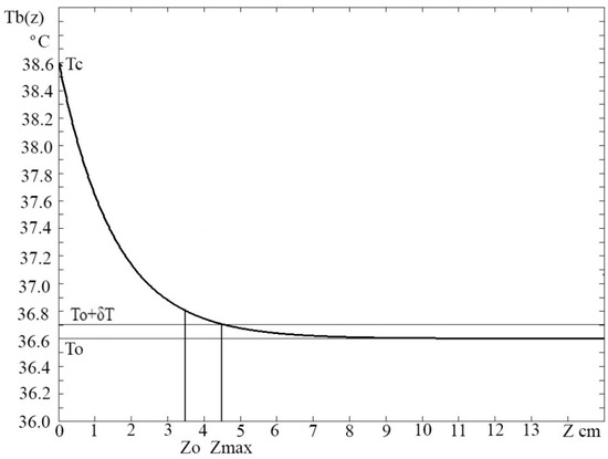 The analysis can be carried out on the basis of a simplified model of thermal fields in the depth of the human body described in [3] where it is shown that the maximum detection depth of the heat source zmax depends on the value of the skin layer zs for a given frequency range, the thermal contrast ΔT of the source and the sensitivity of the radiometer δT by Formula (1):