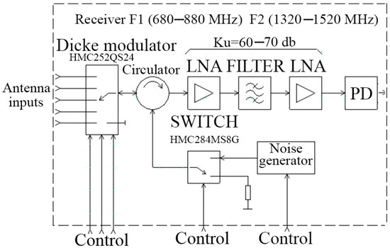 The block diagram of a multi-channel dual-frequency radiothermography is shown in Figure 2. The radiothermograph consists of two identical five-channel UHF (Ultra High Frequency) and L-band radiometric receivers with applicator antennas, two identical signal pre-processing processors (PPP), and an information acquisition and transmission module (IATM) that transmits the collected information data to a personal computer for final processing and visualization of 3D images of the internal thermal field of a human body. The block diagram of a five-channel radiometric receiver is shown in Figure 3. The receiver consists of an input modulator built on a microwave switch chip, a microwave circulator, a multi-stage LNA, a band pass filter, a square power detector, a low-pass filter, and a low-pass amplifier. For the organization of scaterometric reception, the receiver has a noise generator on a noise diode and a noise signal switch.