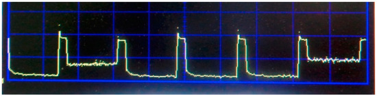 Internal calibration is performed by receiving calibration signals from internal noise sources. In the first sub-period of modulation, signals are received from the receiving channels of the antenna applicators, in the second sub-period from the first channel, in the third sub-period from the second channel, in the fourth sub-period from the third channel, in the fifth sub-period from the fourth channel, and in the sixth sub-period from the fifth channel. In the second sub-period, a signal from the antenna applicator of the first channel is applied to the output of the receiving channel switch for 80% of its duration. The signal from the output of the receiving channel switch is fed through the circulator to the receiver input for amplification and final processing. After the period receiving the signal from the antenna-applicator of the first channel expires, for the remaining part of 20% of the duration of the sub-period, the control code of the switching signal generator is applied to the control input of the switching signal switch to the input of the circulator, after passing in the direction of circulation, it enters the input of the receiving channel switch. The receiving channel switch has been open since thus period, the input of the first receiving channel is connected to the output of the receiving channel switch, and the noise generator signal is not reflected from the switch input, but passes through it and reaches the point of contact of the applicator antenna with the human body. If the antenna-applicator is perfectly aligned with the human body, then the entire electromagnetic wave of the noise generator will be radiated by the antenna-applicator and absorbed into the body. In this case, there will be no reflection from the antenna-applicator–body section and the same power will be recorded at the receiver output as in the first part of the second sub-period. If the antenna applicator is not aligned with the body, the electromagnetic wave generator noise impact from the section of the antenna applicator–the body and the reflected wave with the wave from the human body through the switch receiving channels and the circulator will be passed to the input of a low noise amplifier. Only part of the electromagnetic wave of the noise generator will be reflected from the antenna-applicator–body boundary if antenna is partly matching. It is possible to calculate the reflection coefficient from the antenna-applicator–body boundary by measuring the magnitude of the reflected wave. According to the fundamental principle of reciprocity, the reflection coefficients from the side of the human body and from the side of the antenna-applicator are equal. Therefore, defining the reflection coefficient body antenna applicator can be taken into account which part of the electromagnetic wave radiated by the body is reflected off of the body section–antenna applicator, which according to the experimental data permits us to determine the brightness temperature of the body tissues with one tenth of a degree accuracy when the reflection coefficient does not exceed 30%. For all other receiving channels, from the second to the fifth, the modulation control is similar. Also, the control and signal processing are similar for both frequency bands. The waveform of the analog signal from the output of the power detector is shown in Figure 4. The photo of a multichannel two-frequency radiothermograph located on the experimental stand is shown in Figure 5. The analog signal after the power detector stage is converted to digital form and processed according to the well-known algorithm [12] to calculate the radio brightness body temperatures for each channel and for each frequency range.