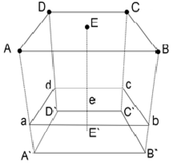 Points A, B, C, D, E are located on the surface of the patient’s body. They contain the radiothermograph applicator antennas that allow to determine the surface temperature at these points and the temperature at a certain depth at points A’, B’, C’, D’, E’. The slice is defined by the abcd plane and is located at the depth of interest. The temperature at points a, b, c, d, and e is determined by linear interpolation between points AA’, BB’, CC’, DD’, and EE’, respectively.