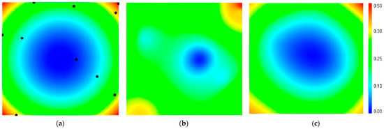 The map of the original function and 10 random points that are used for interpolation is shown in Figure 7a. The result of the inverse distance interpolation, in which the weight of each of the 10 points is inversely proportional to the square of the distance to the interpolated point, is shown in Figure 7b. The result of the interpolation by the proposed method is shown in Figure 7c. It can be seen that the map obtained by this method most closely looks like the map of the original function.