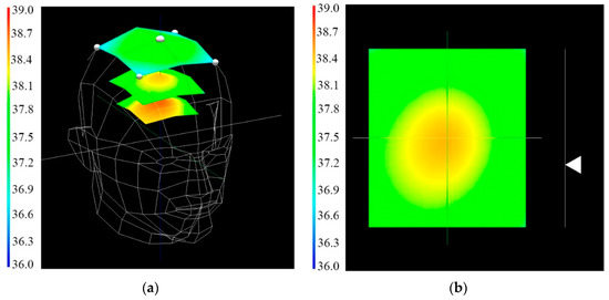 The special program based on the interpolation algorithm described above was developed to display the temperature of a certain area inside the human skull. The layout of the sensors is similar to their location in Figure 6. The human head model was created using a 3D graphics editor. On the monitor screen, the doctor can see one of the two images shown in Figure 8. The schematic representation of a human head with five sensors installed and three surfaces with color temperature markings on them is shown in Figure 8a. The color palette for the temperature is on the left. The upper and lower surfaces are stationary, and the middle surface can be moved either with the keys or with the mouse wheel. In this case, the temperature on this surface is automatically recalculated and displayed as a pseudo-colors. The image can be rotated arbitrarily around the x, y, and z axes for ease of perception. The image of sensors and any surfaces can be disabled. The temperature distribution on the middle plane, as well as the depth of the plane, is shown in Figure 8b. In this form, all the data obtained during the analysis are available. Presented in this way, the dynamic data of the 3D distribution of the internal temperatures of the human body allow the doctor to more accurately determine the location of the pathology in its presence.