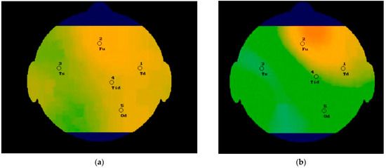 The result of an experimental research of the human head. At the frequency F1—(a) and F2—(b).