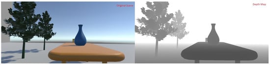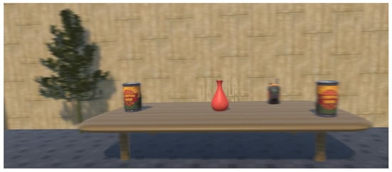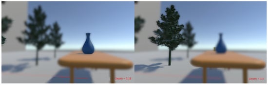 We consider three conditions: one with our foveated DoF technique enabled (referred to as FD), and one with the Unity’s post-processing stack blur (see the developer’s website https://docs.unity3d.com/Packages/com.unity.postprocessing@3.1/manual/Depth-of-Field.html (accessed on 6 April 2021)) enabled (referred to as GC), and one with the scene with no blur present (referred to as NB). The full fidelity NB condition acts as the control group. The Unity blur GC condition only implements the depth-of-field effect using a 7-pass shader. It also uses the Bokeh effect to introduce spatial blur in the peripheral regions. The size of the Bokeh filter in the Unity blur condition and our foveated depth-of-field condition were kept the same to ensure comparability. The Unity blur does not explicitly support eye-tracking or VR devices so a custom interface was developed to integrate the eye-tracking module with the Unity blur effect to provide gaze-contingency.