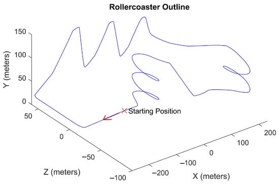 Rollercoaster track outline. The arrow indicates the direction of motion. The coordinate system follows the convention used in Unity, i.e., X: right direction; Y: up direction; Z: forward direction.