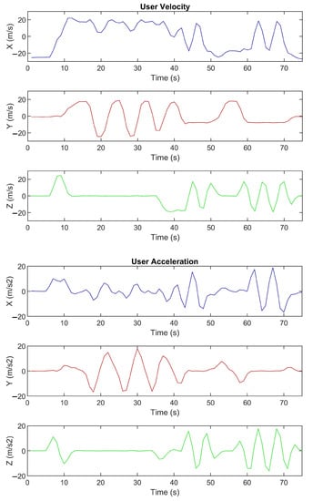 Instantaneous user velocity and acceleration components during each rollercoaster cycle. The coordinate system follows the convention used in Unity, i.e., X: right direction; Y: up direction; Z: forward direction. Seesaw motion: 8–32 s; spiral motion: 36–44 s and 48–64 s.