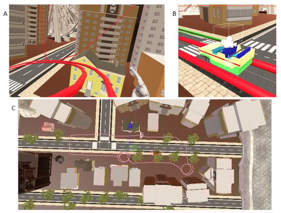 Rollercoaster virtual environment. (A) user-view; (B) rollercoaster cart with VR camera attached; (C) top view of the clustered environment.