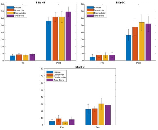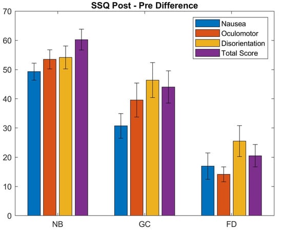 The differences between the Pre and Post scores (see Figure 12 and Table 2) show that the amount of increase in individual subscales is highest in NB sessions ranging between 49–54. The conditions with spatial blur incorporated (GC and FD) show the highest change in disorientation scores which is related to the vestibular disturbances. The amount of induced disorientation is similar in the NB and GC conditions. Although the range of individual subscores is different, the results demonstrate that the three conditions produce slightly different patterns of symptomatology, i.e., NB: D ≈ O ≈ N; GC: D > O > N; FD: D > O ≈ N.
