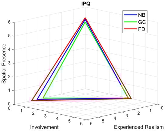 To measure SS, users had to fill the Simulator Sickness Questionnaire (SSQ) []. The SSQ consists of 16 questions, to be answered on a 4-point Likert scale. The SSQ scores reflect the level of nausea, oculomotor disturbance, disorientation, and overall severeness of induced sickness. The questionnaire was filled by each user immediately before (Pre) and after (Post) each session. To measure user experience between each type of session, the Igroup Presence Questionnaire (IPQ) [] was used. The IPQ consists of 14 questions, to be answered on a 7-point Likert scale. Each user filled the IPQ after each session.