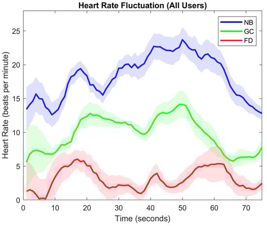 Average heart rate fluctuations from a resting heart rate during a rollercoaster cycle. Origin on the heart rate axis represents the resting heart rate. (conditions: NB—No Blur; GC—Unity Blur; FD—Ours).