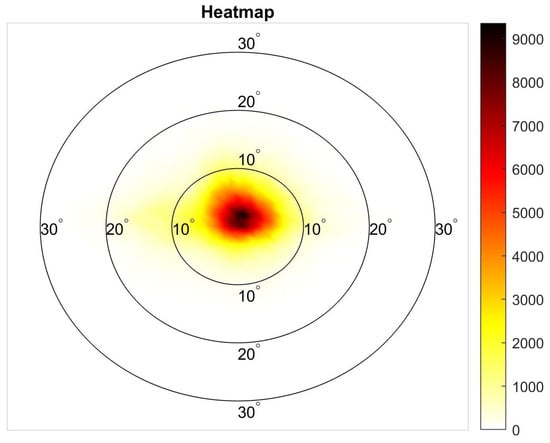 In order to better understand how a user behaves/interacts with a VR device, we analyzed the gaze data collected from the experimental sessions. Approximately 4% of the eye tracking data was discarded. This was due to the fact that, during the experiment, for some frames, the users either blinked/closed their eyes or there was faulty sensor reading. Figure 15 shows the combined heatmap of all users. It can be observed that the users tend to fixate mostly on the center of the scene. Positional and orientation data of the user revealed that, when they had to focus on an object further away from the center, they preferred to move their heads instead of just the gaze. This observation is in support of studies conducted by Kenny et al. [] on first person shooter (FPS) games which highlighted that user gaze is mostly directed towards the center of the view (approximately 85% of the time). Consequently, it can be assumed that gaze related user behavior in VR is similar to FPS games, verifying the assumptions taken in other user studies in the absence of eye tracking [,].