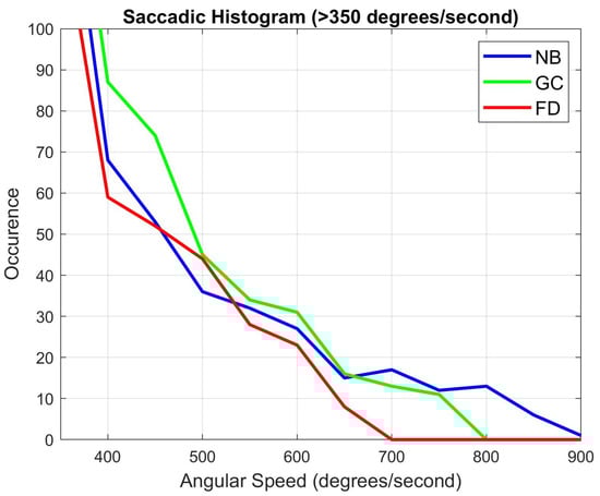 Figure 16 describes the number of occurrences for speeds higher than 350°/s. It should be noted that speeds lower than this value had a similar trend in all the three conditions, so they are not shown here. Previously, the SSQ revealed that the level of sickness in the no blur sessions is higher than our blur system. Correspondingly, there may be a correlation between the occurrences of faster saccades with the level of induced sickness. The temporal analysis revealed that higher peaks were observed mostly during the seesaw motion.
