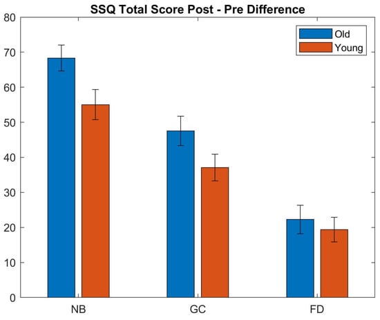 Comparison of the Post–Pre difference of the SSQ scores for each condition with respect to age groups (conditions: NB—No Blur; GC—Unity Blur; FD—Ours). The plot shows the changes in individual SSQ total scores between the Pre and Post experiment conditions for the two age groups. Old: NB 68.34, GC 47.55, FD 22.26; Young: NB 55.03, GC 37.06, FD 19.38.