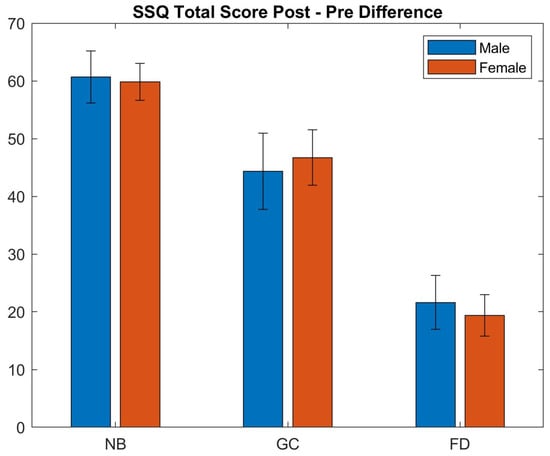 Comparison of the Post–Pre difference of the SSQ scores for each condition with respect to gender groups (conditions: NB—No Blur; GC—Unity Blur; FD—Ours). The plot shows the changes in individual SSQ total scores between the Pre and Post experiment conditions for the two age groups. Male: NB 60.67, GC 44.37, FD 21.63; Female: NB 59.84, GC 46.72, FD 19.39.