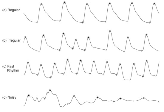 Four types of PPG templates. The regular, irregular, fast-rhythm, and noisy templates are (a–d), respectively. The “*” and “+” in (a–d) refer to the annotated systolic peak and onset, respectively.