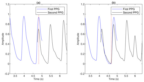 Comparison of stitching two PPG signals together based on the systolic peak or based on the onset. (a) First and second PPGs aligned based on the systolic peak. (b) First and second PPGs aligned based on the onset. The red dotted lines in (a,b) are the aligned lines of the first and second PPGs.