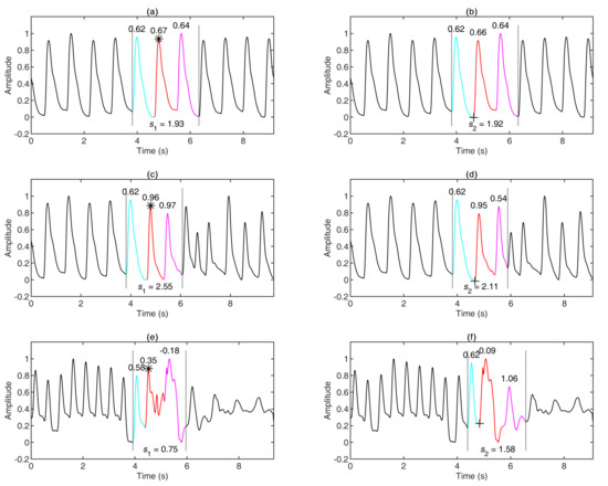 Three examples of stitching results. (a,b) are the results of stitching two regular PPGs together based on the systolic peak and the onset, respectively. (c,d) are the results of stitching a regular PPG with an irregular PPG based on the systolic peak and the onset, respectively. (e,f) are the results of stitching a noisy PPG with an irregular PPG based on the systolic peak and the onset, respectively. The stitching points are denoted as “*” in (a,c,e) and as “+” in (b,d,f). The cyan, red, and magenta parts are the previous, stitching, and next beats, respectively. The numbers above the curve represent the skewness of the beat. The “” and “” refer to the skewness index in the stitching methods based on the systolic peak and the onset, respectively.