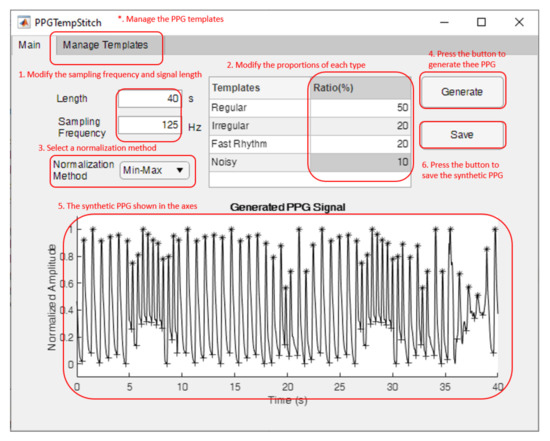 Figure 5 shows the main dialogue of the graphical user interface (GUI). Four types of PPG templates were supported in the GUI. These templates were extracted from different subjects in MIMIC III database. To synthesize an annotated PPG, users could complete all their work in the main menu. First, the signal length and sampling frequency of the synthetic PPG were modified. The PPG signal needed be longer than five seconds, the length of all the PPG templates, and so the stitched PPG was resampled to the required sampling rate when the needed sampling frequency was not 125 Hz.