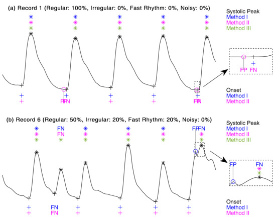 Comparison of the three methods’ results. (a) Four-second segment of Record 1. (b) Four-second segment of Record 6. The black ‘*’ and ‘+’ refers to the annotated systolic peaks and onsets, respectively. The blue, magenta and dark-green ‘*’ are the true-positive systolic peaks of Methods I, II, and III, respectively. The blue and magenta ‘+’ are the true-positive onsets of Methods I and II, respectively. ‘FP’ and ‘FN’ are the false-positive and false-negative, respectively. The ‘○’ is used to show the location of the false-positive.