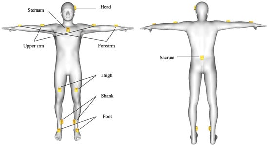 An IMU-based MoCap was used to measure the joint angle of the whole body. Thirteen IMUs (MTw; Xsens Technologies Inc., Enschede, Netherlands) were attached to the participant’s head, sternum, sacrum, and to the two upper arms, forearms, thighs, shanks, and feet (Figure 1). Participants were allowed to use their own shoes to walk to ensure high fidelity in the measurement of the natural function of the knee [13]. Before measurements, IMU orientations relative to the corresponding body segments were determined using a reference pose (i.e., T-pose) for calibrating the motion capture system.