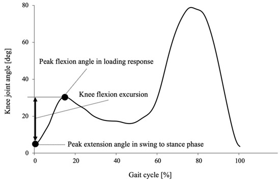 The motion data were digitally filtered using a Butterworth low-pass filter with a cut-off frequency of 6 Hz. We defined the beginning of a gait cycle (initial contact) as the point of peak knee extension angle in a swing to stance phase. The knee flexion excursion in the loading response was calculated from the displacements between the peak extension angle and peak flexion angle in the loading response (Figure 2). Data for five strides during steady-state walking were extracted. The stride length was calculated using the distance of the feature point at the heel. Walking speed was calculated using the stride length and time. The average of the values calculated from the five gait cycles was used for analysis.