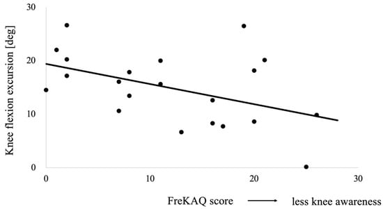 The relationship between the knee flexion excursion in loading response at fast speed and the Fremantle Knee Awareness Questionnaire (FreKAQ) score. High FreKAQ score indicates less knee awareness.