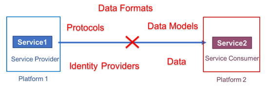 However, today’s IoT platforms are largely heterogeneous, vendor-specific, vertically oriented, fragmented functionality-wise, and locked behind their own closed identity and access management mechanisms [1,2]. Because of the interoperability gaps between services of different platforms at the levels of interfaces, communication protocols, data formats, data models, identity providers, etc., it is not possible to form composite applications with services from multiple platforms (Figure 1).