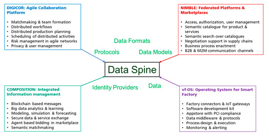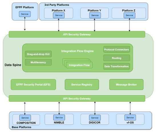 The EFPF ecosystem is initially aimed at interlinking four digital manufacturing platforms from the European Factories-of-Future (FoF-11-2016) cluster focused on supply chains and logistics [5]—namely NIMBLE [6], COMPOSITION [7], DIGICOR [8], and vf-OS [9]. Apart from interlinking the four FoF-11-2016 platforms, which we refer to in this paper as “base platforms”, the EFPF ecosystem is envisioned to be an extendable system capable of interlinking more third-party platforms in the future. Therefore, in order to meet the need for incorporating new tools, services and platforms in the digital platform ecosystem, this paper presents the architecture of the EFPF Data Spine, which is designed at its core to deliver an interoperable, modular and extensible platform solution.