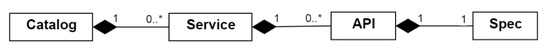 The abstract class diagram for the service registry (Figure 4) shows composition relationship between its classes. The notation ‘0..*’ in the diagram denotes ‘zero or more instances’ of the concerned entity. As illustrated in the diagram, the ‘Catalog’ of the service registry can have zero or more services, each ‘Service’ has zero or more APIs, and each ‘API’ has exactly one ‘Spec’ (specification). Table 2 further shows the abstract schema for the Service object. The API Spec is obtained from an API Spec document, which needs to conform to one of the following standards in order to ensure uniformity across and completeness of API specifications: