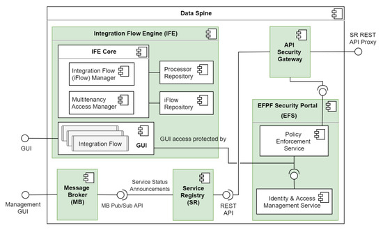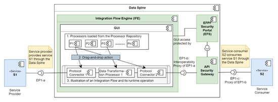 In addition, the IFE offers an intuitive, drag-and-drop style Web-based graphical user interface (GUI) which can be used to create the integration flows based on the concepts from visual programming [32] paradigm. The IFE and its GUI support multitenancy. The GUI can be configured based on the defined access control policies to allow or restrict visibility of and/or access to certain GUI elements. In addition, access control policies, such as a user or a user group being able to view and manipulate only the integration flows created by him/her/them, can also be defined, and enforced. Thus, the GUI of the IFE supports multitenancy and enables collaboration among system integrator users who create the integration flows. Moreover, the IFE supports standard authentication protocols such as OpenID Connect (OIDC) to secure access to its GUI using a pluggable authentication provider such as Keycloak [33]. This ensures authentication of the same users from the EFS, the identity provider for EFPF.