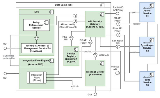 The API security gateway (ASG) acts as the policy enforcement point (PEP) for the Data Spine, enabling secure communication among platforms. The ASG intercepts all the traffic to the Data Spine and invokes the security service ’EFPF Security Portal (EFS)’ for authentication and authorization decisions. The ASG automatically creates reverse-proxy endpoints for the API endpoints of services, which are registered in the Service Registry of the Data Spine. Fine-grained access control policies for these proxy endpoints can then be configured in the EFS.