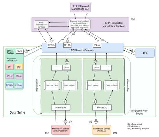 We performed a quantitative evaluation of both approaches where the response times were measured as a sum of the time taken for calling NIMBLE platform’s marketplace service and for transforming the response to adhere to the Integrated Marketplace’s data model. The integrated marketplace applications were realised as Java programs that recorded the response times. The Data Spine components were realised using the technologies elaborated in Section 5. Apache NiFi, LinkSmart Service Catalog and RabbitMQ were deployed on a machine with 2 vCPUs and 8 GiB RAM alongside 5 other Docker containers. Apache APISIX and Keycloak were deployed on another machine at a different physical location with 4 vCPUs and 16 GiB RAM alongside 14 other Docker containers. To minimise the impact of public network traffic variations, the experiment was repeated 500 times for each of the two approaches and the average response times were calculated. For approach (a), the average response time was 192.36 ms, whereas for (b), it was 228.03 ms. This overhead of 35.67 ms relates to the two additional proxy endpoints introduced in the Data Spine approach as highlighted in Figure 15. We plan to reduce this overhead by deploying all the components of Data Spine at the same local network and by optimising the resource allocation further. Moreover, approach (a) requires getting an access token from every connected platform separately and managing those. Thus, the total response time (time taken for getting the required access tokens plus time taken for calling the services and performing the data model transformation) increases with increase in the number of platforms involved in the composite application. By contrast, in approach (b), only one API call to the EFS is needed to obtain an EFPF access token, reducing the total response time significantly.