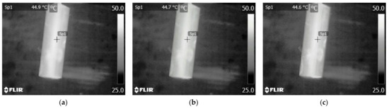 Thermograms presenting the Pt 1000 temperature sensor in a cylindrical case with a diameter of 3 mm. The thermograms are taken with the following distances between the lens and the object under observation: (a) 33 mm—distance between the additional thermographic camera lens and the observed object, as proposed by manufacturer. Temperature measured in Sp1 = 49.6 °C; (b) 33.1 mm. Temperature measured in Sp1 = 49.5 °C; (c) 34 mm—maximum allowable value of the distance between lens and object, which allows obtaining a sharp thermogram (by manufacturer). Temperature measured in Sp1 = 49.3 °C.
