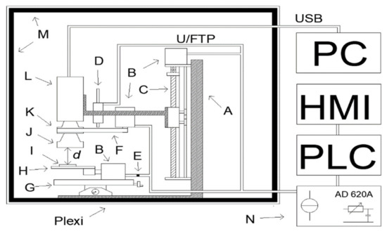 Schematic view of the measurement system: (A) tripod; (B) stepper motors; (C) linear guide; (D) resistance linear distance sensor; (E) connector; (F) rubber belt; (G) cross table; (H) additional table with adjustable angle position relative to thermal camera lens; (I) observed object; (J) additional macro lens: Close up lens 2x P/NT 197200; (K) thermal imaging camera lens; (L) thermal imaging camera; (M) polyurethane foam; (N) additional module with sources of current, filter systems and measurement amplifier; (d) WD (work distance)—distance between the observed object and thermal imaging camera macro lens = 33 mm.