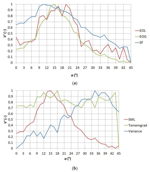 Relationship between the standardized value of sharpness measures V′ and the angle of focusing ring mounted on the thermographic camera lens α for the first series of thermograms (a) EOL, EOG, and SF (b) SML, Tenengrad, and Variance.