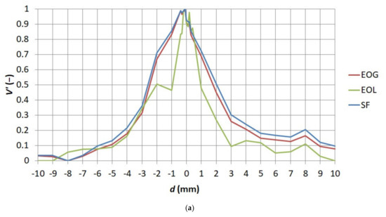 Figure 5 and Figure 6 present the standardized values of the obtained measures of sharpness. It was decided to present results obtained for the first series to show the distribution of the standardized values of each of the measures in function V′ = f(α) and to present results obtained for the fourth series to show the distribution of standardized values of each of the measures in function V′ = f(d).