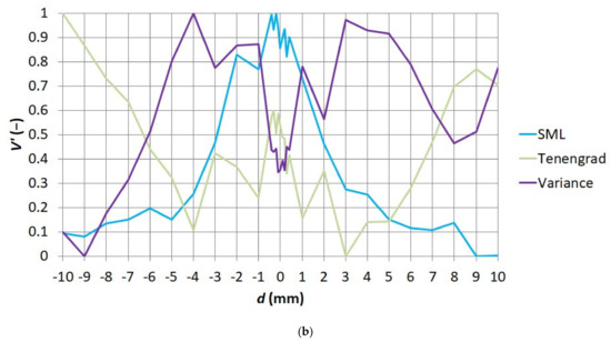 Relationship between the standardized value of sharpness measures V′ and the distance between the thermographic camera lens and observed object d for the first series of thermograms (a) EOL, EOG, and SF (b) SML, Tenengrad, and Variance.